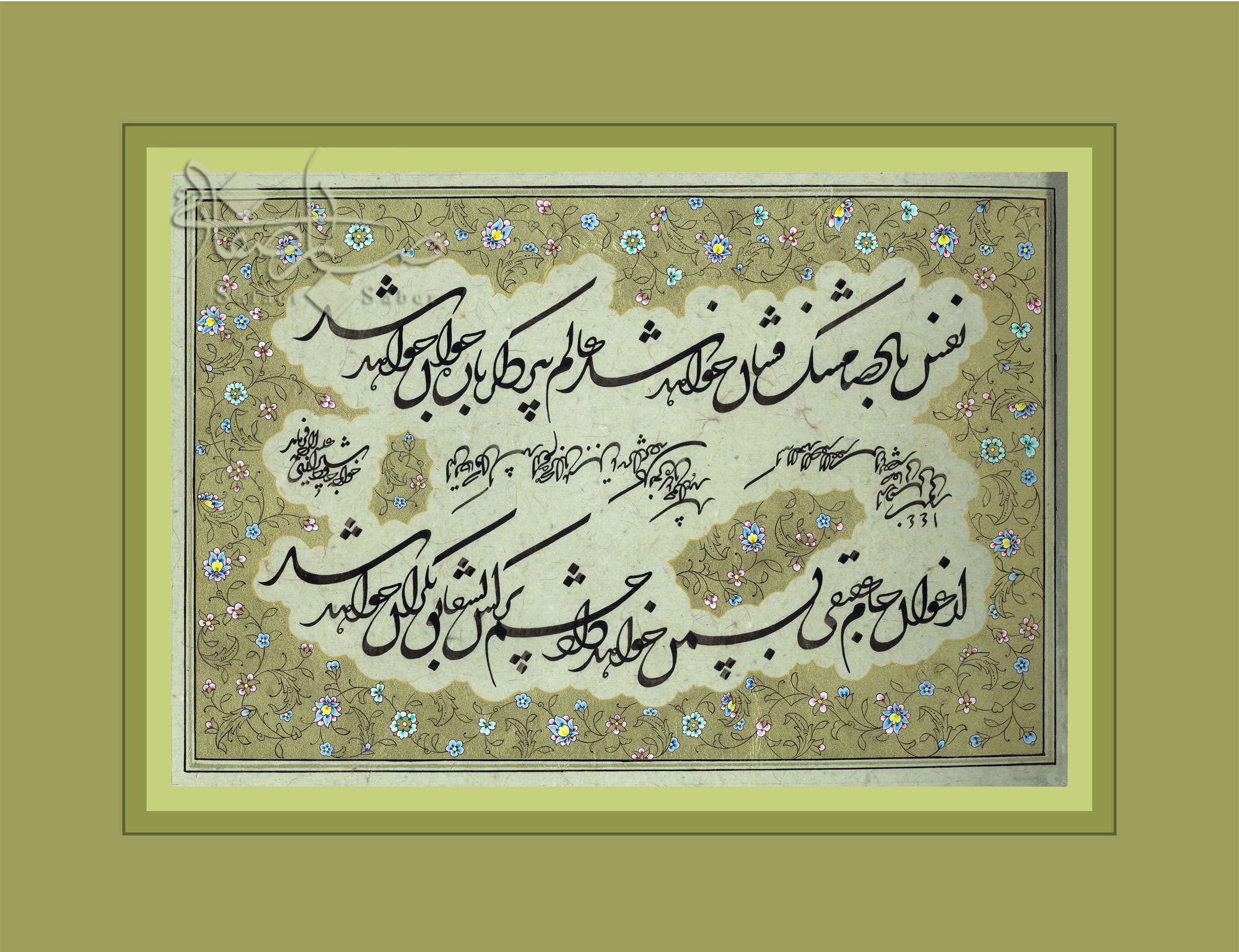 هذا العمل مكتوب بخط التعليق، وهو في الواقع أول خط إيراني مخصص لكتابة النصوص الفارسية. بعد اختراع الخطوط الإيرانية الأخرى، نُسي هذا الخط، لكن الأستاذ صفائي وبعض أساتذة الخط عملوا على إحيائه وأقاموا معرضًا في طهران، وكان هذا العمل أحد الأعمال المعروضة.