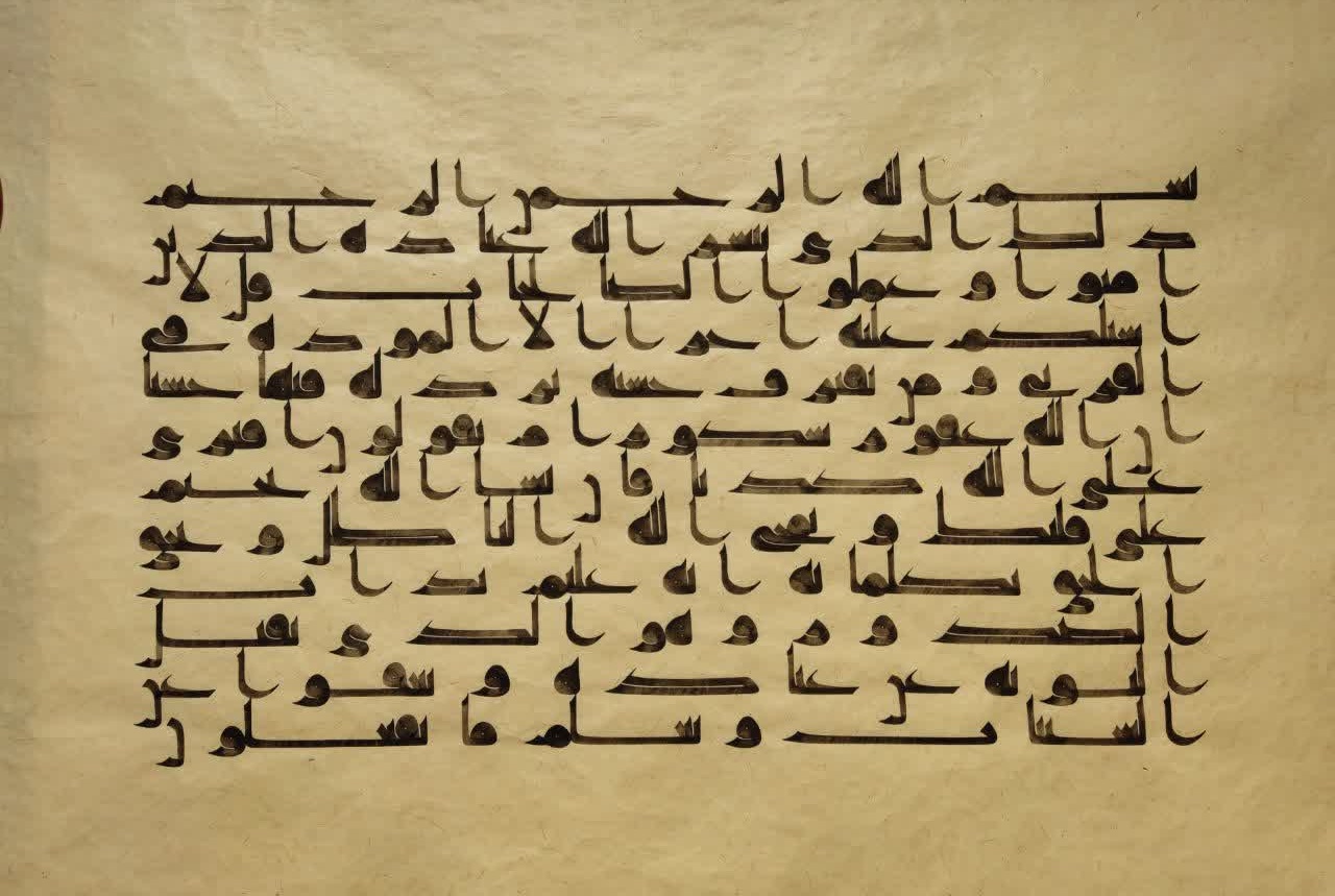 - التقنية: الخط الكوفي التحريفي والورق المصنوع يدويًا