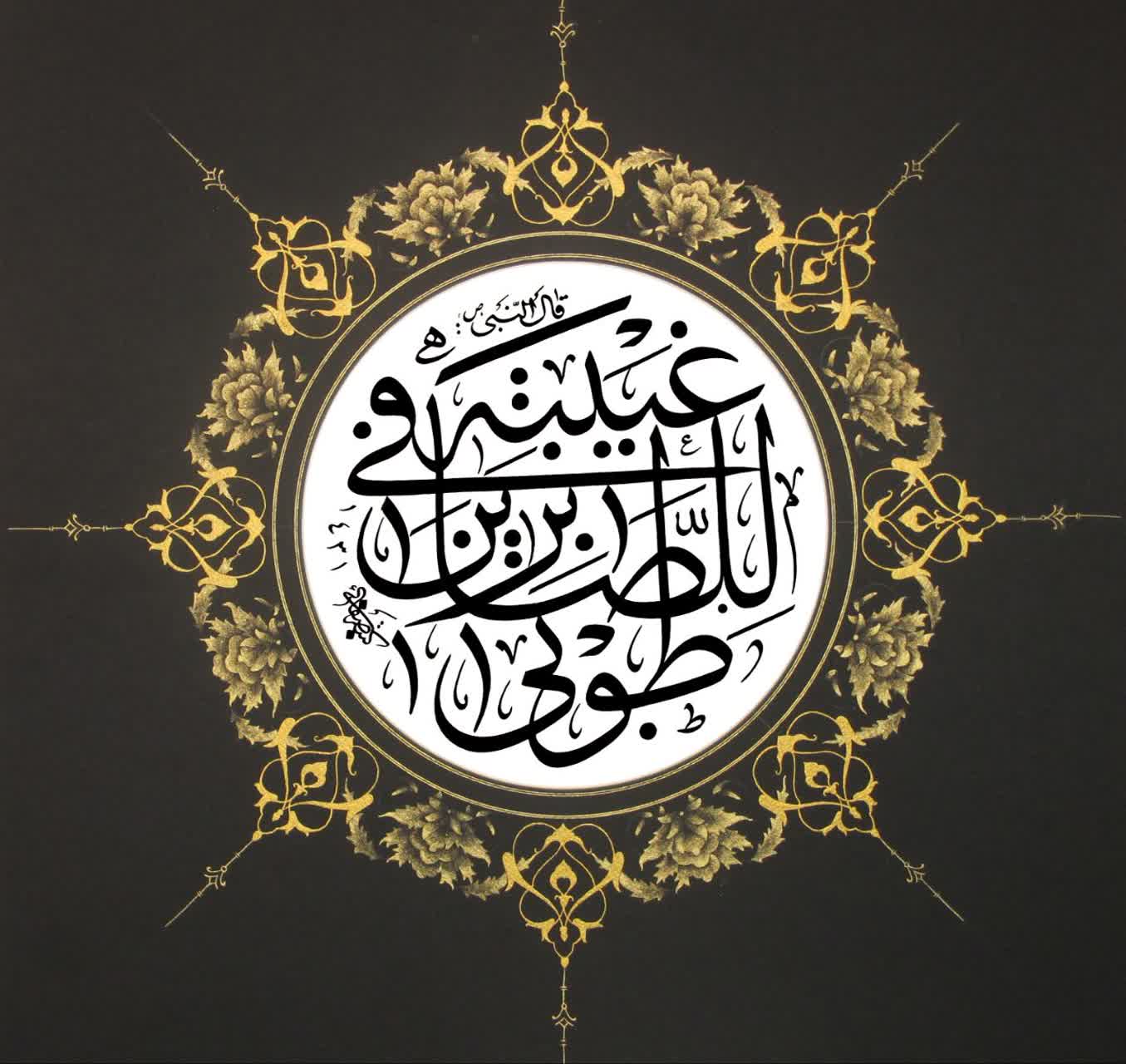 • نوع و قالب: خط ثلث جلی و کاغذ دست ساز. قالب هندسی دایره ای