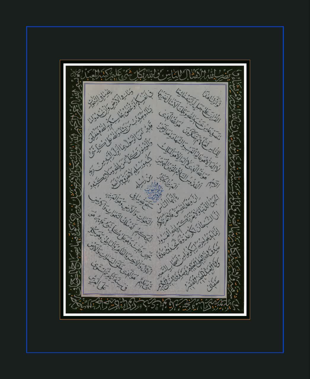 3. مرحله سوم، اجرای اصلی اثر هست. چون این اثر ترکیب بندی خاص و سختی دارد دارای اهمیت و حساسیت زیاد بوده و شاید دهها برگ کاغذ، برای اجرای آن استفاده شده است. همچنین خط رقاع که بر روی کاغذ دست ساز و به صورت رنگه نویسی در حاشیه و اطراف متن نوشته شده، نیاز مند دقت و ظرافتی خاص بوده است.